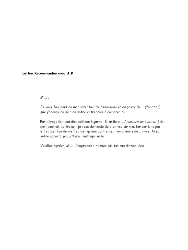 Un salarié en cdi est libre de donner sa démission à son employeur lorsqu'il souhaite quitter son emploi. Pour donner sa démission, il faut prévenir son employeur et, dans la plupart des cas, respecter un préavis (délai durant lequel on ne peut pas quitter l'entreprise avant la rupture effective du contrat de travail). Compte tenu du délai de préavis de … jours qui résulte de la convention collective dont je dépend, je quitterai donc. Avoir recours à une lettre de démission sans préavis est la manière la plus professionnelle de partir d'une société dans les plus brefs délais, ou voici 2 exemples de lettres de démission sans préavis qui vous permettront de demander à votre employeur de supprimer totalement ou partiellement la. La démission permet au salarié de rompre son contrat de travail à durée indéterminée de sa propre initiative, à condition de manifester clairement sa volonté et de respecter le délai de préavis éventuellement prévu dans son contrat, sauf dispense expresse de l'employeur ou motif prévu par la.